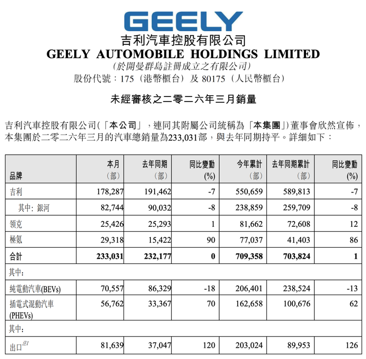 新能源再怎么吹,有一个现实没法绕过去:吉利品牌一季度550659辆,依然是整个集团的压舱石。