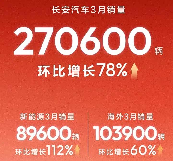 长安汽车在今年3月迎来环比增长78%的好成绩,单月销量达到270600辆。具体到各品牌,长安汽车以新能源与燃油车双线并进,长安引力序列3月销量高达103900辆,长安逸动、CS75系列月销量均2万辆。