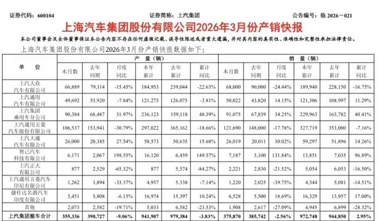 上汽集团发布3月产销快报,数据显示整车销量为375870辆,同比下跌2.56%。其中上汽大众3月销量68000辆;上汽通用50022辆,同比上涨14.15%;上汽乘用车91075辆,同比大增34.25%;上汽通用五菱121690辆;上汽大通26019辆,同比增长30.02%。智己汽车7187辆,同比暴涨131.84%。