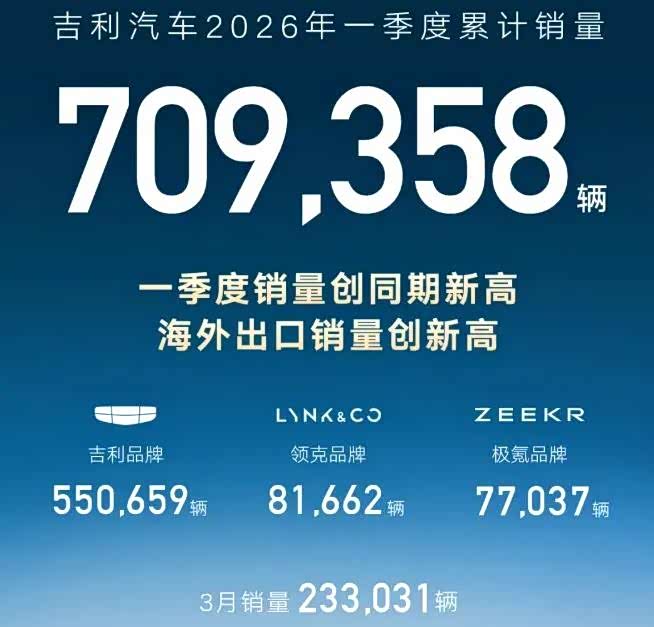 值得一提的是,吉利汽车一季度累计销量达到70.9万辆,超越比亚迪,强势夺得中国品牌销量冠军。按照计划,吉利汽车2026年销量目标为345万辆,达成的希望很大。据轱辘哥了解,吉利汽车将会在4月份发动猛烈的新车共识,极氪8X、银河M7等重磅车型将会打开新增量空间。