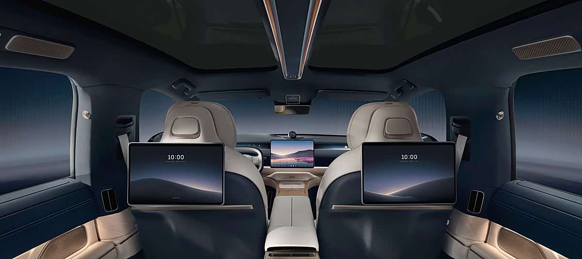 固定四座独立布局专为商务场景设计,第二排座椅支持加热、通风、按摩功能,搭配双14.5英寸3K OLED 后排屏、小桌板与220V电源,让后排乘客在出行途中也能高效办公或放松休憩。
