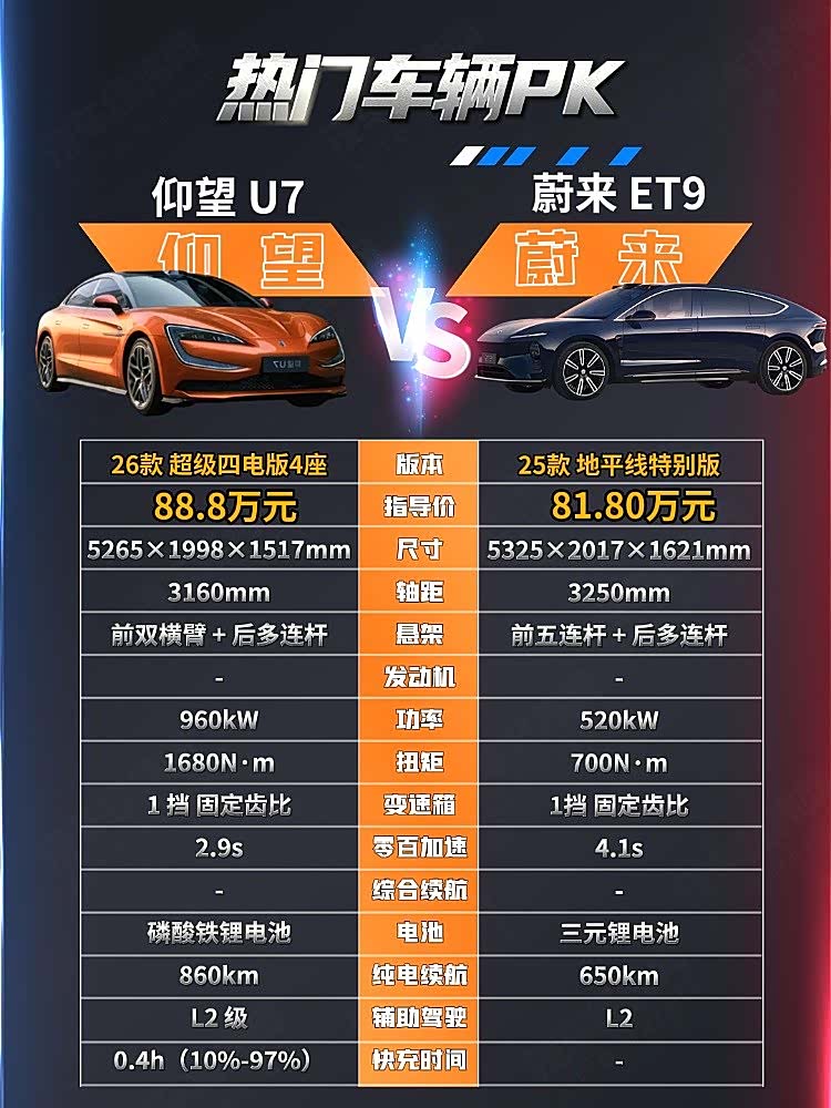 一边是2.9 秒破百、1006km续航的性能猛兽,一边是专属四座、换电无忧的商务旗舰。仰望U7把性能豪华做到极致,蔚来ET9将商务舒适推向顶峰,80万级高端纯电,从来没有标准答案,只有最贴合你的选择。
