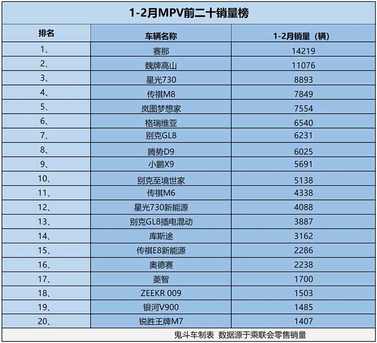 日前,乘联会发布1-2月零售销量数据, 鬼哥整理出1-2月MPV市场销量排名前二十榜单,结果发现,整个榜单上,只有两款MPV车型1-2月累计零售销量超过万辆,可以用一片惨淡来形容。接下来,看看具体车型排名与销量表现?