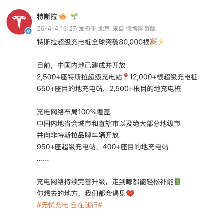 从相关渠道获悉,2026年第一季度充电网络总输出电量达1.8太瓦时,同比增长22%,2025年全年输电更是达到6.7太瓦时,可支撑超过447亿公里的行驶里程。按照规划,2026年底全球超级充电桩目标将突破10万根,其中中国市场计划再新增5000根,同时继续扩大开放范围,预计年底开放超1200座超充站。