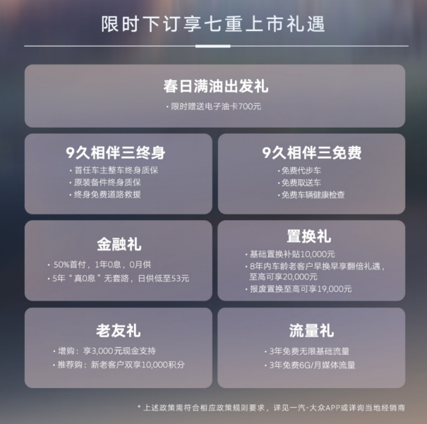 为让用户轻松购车、安心用车,全新揽巡推出七重限时上市礼遇,权益详细且实用。春日满油出发礼赠送700元电子油卡,开启出行第一步;9久相伴三终身保障用车全周期,首任车主享整车、原装备件终身质保与终身免费道路救援;9久相伴三免费服务覆盖日常用车,免费代步车、取送车、车辆健康检查一应俱全;金融礼灵活选择,50%首付1年0息0月供,5年真0息日供仅53元;置换礼力度空前,基础补贴10000元,老车主置换至高20000元,报废置换至高19000元;老友礼福利双享,增购3000元现金,推荐购新老客户各10000积分;流量礼长期赠送,3年无限基础流量+6G/月媒体流量,智能出行不断联。