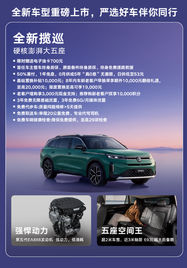 为让用户轻松购车、安心用车,全新揽巡推出七重限时礼遇,权益详细且实用。满油礼赠700元电子油卡;三终身保障用车无忧;三免费服务省心省力;金融礼低门槛购车;置换礼至高补贴20000元;老友礼现金与积分双享;流量礼长期免费畅用。