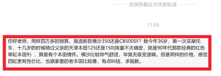 先简要来看一下题主的描述“这位车友今年36岁,虽然是第一次买摩托车,但早期也骑过父亲的本田摩托,所以有一定的骑行经历和个人情怀,进而就将目光瞄向了本田刚发布的新款佛沙350和CB500SF”。对于这两款车纠结的点是外观和性价比。