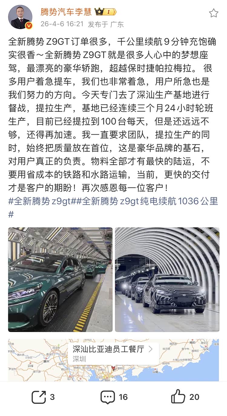 不过,最近一段时间,比亚迪在某些方面的“风评”似乎不是很好,因为很多小伙伴在比亚迪的身上,看到了造车新势力的影子,包括很多 腾势Z9GT(参数|询价)、海狮06 EV等下单车主都在吐槽,说比亚迪的交付太慢了。就连腾势品牌总经理李慧都公开表示,目前腾势Z9GT的产能已经达到了100辆左右每天,但还是远远不够,很多用户还在催着交车,大家对提新车急切心情跃然纸上了……