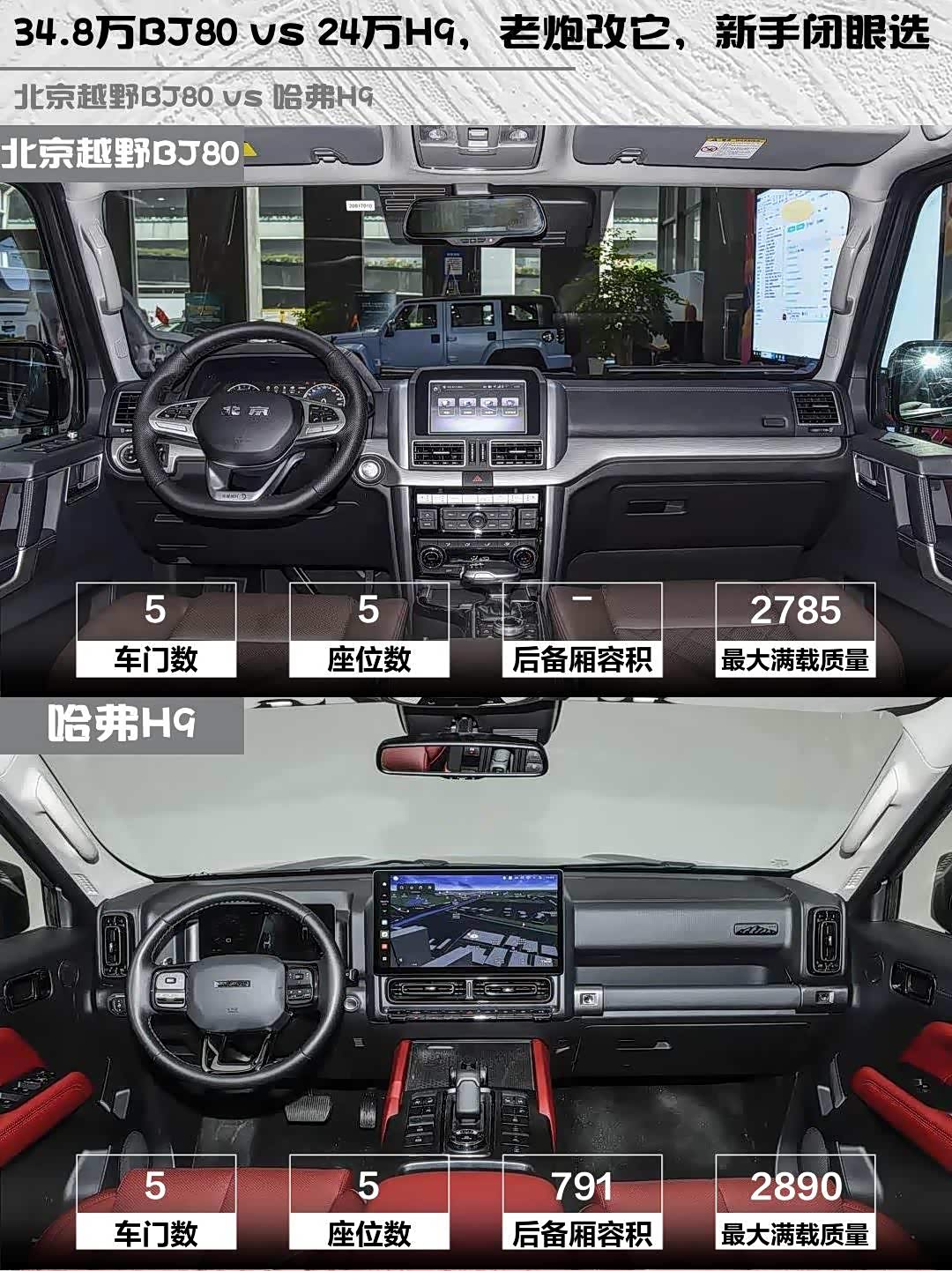 最后说价格,BJ80指导价34.8万走高端路线,适合追求大排量和改装乐趣的玩家;H9 23.99万还送5年质保,性价比直接拉满。两台车定位其实不太一样——要面子要改装选BJ80,要实惠要全能选H9。你们会怎么选?评论区见!👇