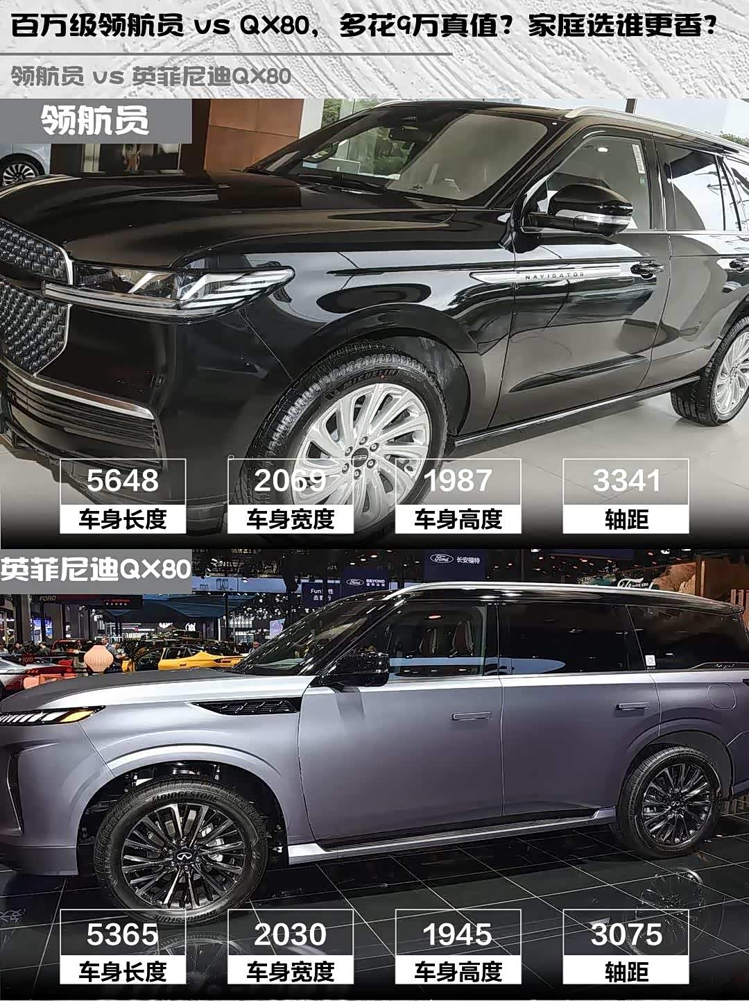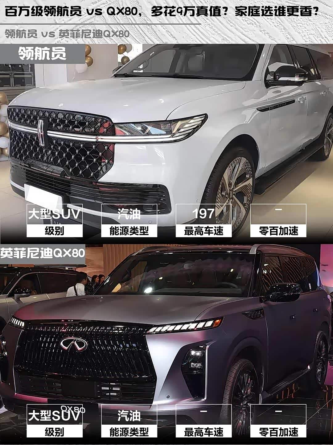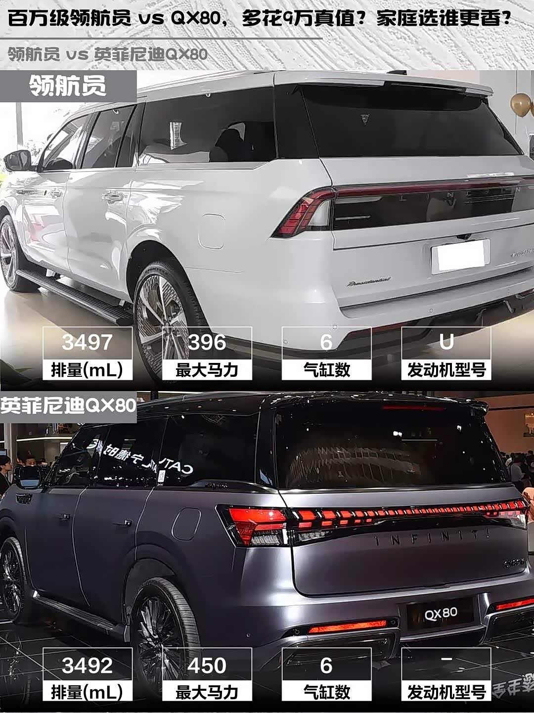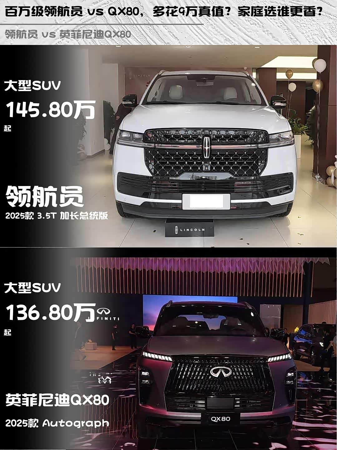 今天来聊聊两款百万级豪华SUV的硬核对比——林肯领航员2025款3.5T加长总统版 vs 英菲尼迪QX80(参数|询价) 2025款Autograph!这两台美系和日系的旗舰选手,到底谁更值得掏腰包?🤔