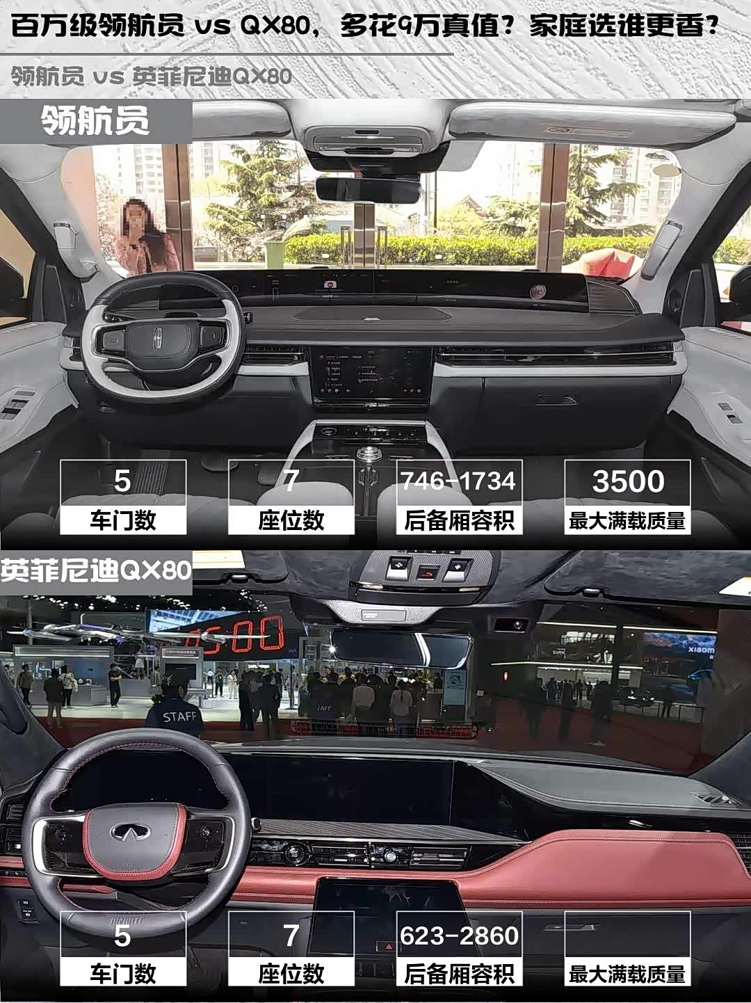 最后说价格:领航员145.8万比QX80贵9万,但多了电动踏板、后排独立空调等配置。要我说,喜欢美式豪华感和商务接待选领航员,追求运动操控和家庭出游QX80更合适。你们会pick哪台?