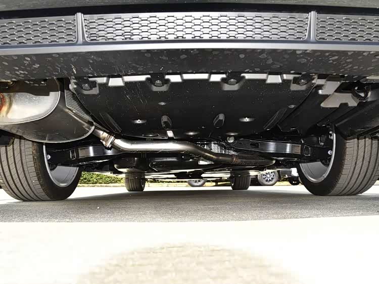 前脸部分,大尺寸网格状进气格栅采用全黑喷涂处理,与两侧三眼式LED大灯及LED日间行车灯共同构成了凌厉而深邃的前部造型。车身侧面,黑色涂装的轮辋、黑色门把手以及黑色车窗饰条将整车下半部分的视觉重心压低,配合近5米的车身长度,全黑涂装在视觉效果上带来了明显的拉伸感。车尾部分,贯穿式尾灯组经过熏黑边缘处理,与整体黑色主题保持统一。