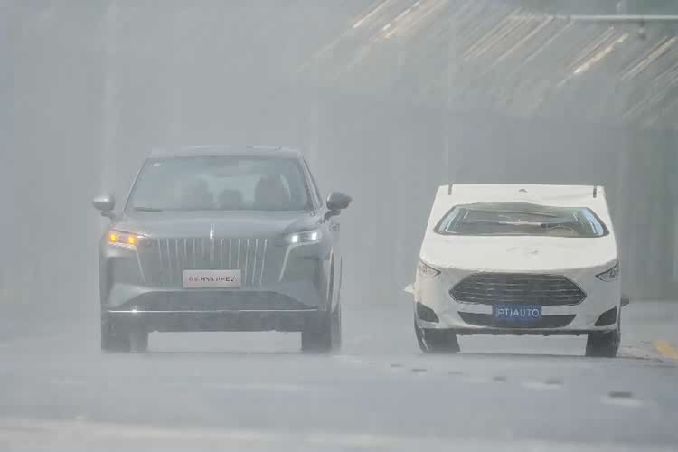 还有高速上最容易出二次事故的雨雾天静止故障车场景。中雨天气能见度下降,红旗HS6在80km/h 时速下,也能精准识别到前方的静止故障车辆,平稳减速加变道绕行过去,而且就算是开启LCC的工况下,100km/h 时速也能平稳避障绕行,没有丝毫慌乱,要知道,这个时候的能见度已经不足50米了,想要依靠肉眼识别在反应的话那基本够呛。