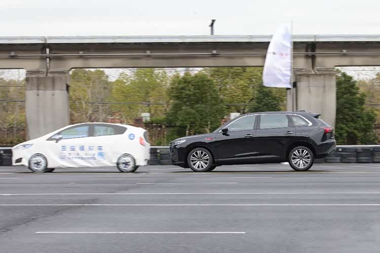 再到第二个测试环节,高速避障测试。第一个就是所有车主最怕的“鬼探头”场景。路边停了辆货车,儿童假人会突然从车后冲出来,测试车以50km/h的时速行驶,这种场景,就算是老司机,也难免会反应不及。但红旗HS6在假人进入视野的瞬间,就开始重刹了,非常果断迅速,也正因为如此,刹车距离也不长,完美通过。