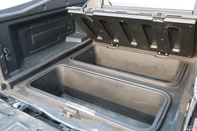 国产皮卡在货箱储物空间上的挖掘仍处于初步阶段。前几年中国重汽推出了乘用式皮卡VX7,该车采用了平底货箱的方式,货箱两侧设置了让空间更加富余的掏空设计,即使货箱里装满了东西,也仍然可以在这些边边角角的位置塞进一些小件物品。此外,它的货箱平面其实是两个盖板,打开后部的锁扣,掀起盖板还能看到两个巨大的底部储物格。不过,VX7因销量不佳逐渐淡出市场,而最新上市的郑州日产Frontier Pro PHEV同样在储物空间上做了小小的挖掘。除了右侧常规的外放电插座外,该车货箱左侧还有一个比较小的储物格,能放随车工具,或者绳索之类的物品。