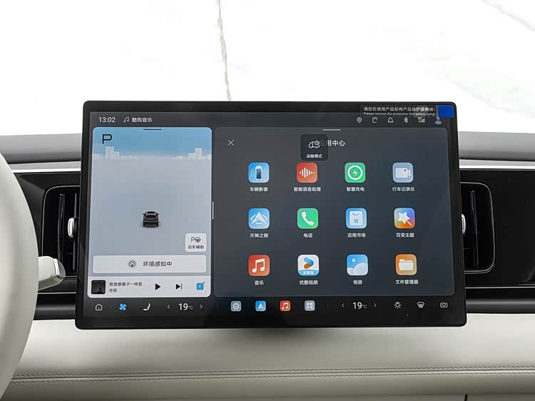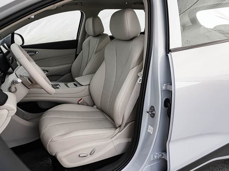 座椅及中控台大面积软质包覆,提供杏仁米、暮色蓝两种配色。座椅厚实,前排支持电动调节、加热与通风,后排地板平整,座椅可4/6比例放倒。