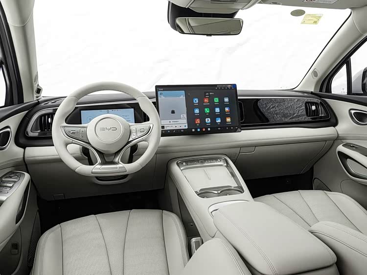 配备8.8英寸内嵌式全液晶仪表、15.6英寸自适应旋转悬浮中控屏,搭载DiLink系统。副仪表台为上下双层,上层设50W无线充电面板、实体按键与双杯架,下层为镂空储物空间。