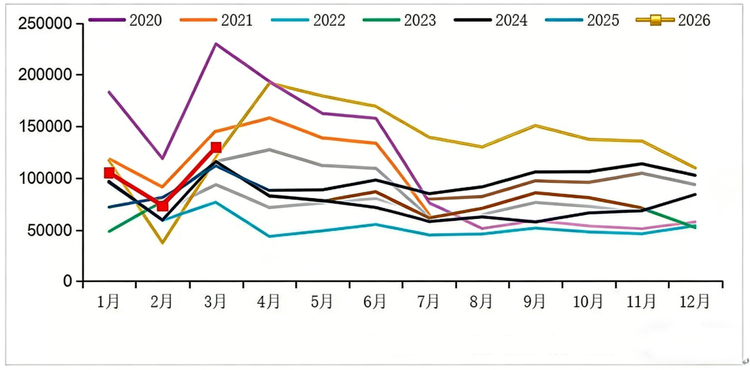 2020-2026年我国重卡市场销量月度走势图(单位:辆)