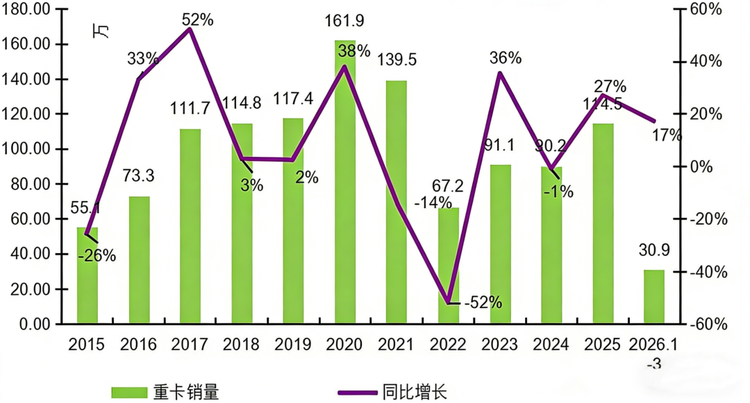 2015-2026年我国重卡行业销量年度走势图(单位:万辆)