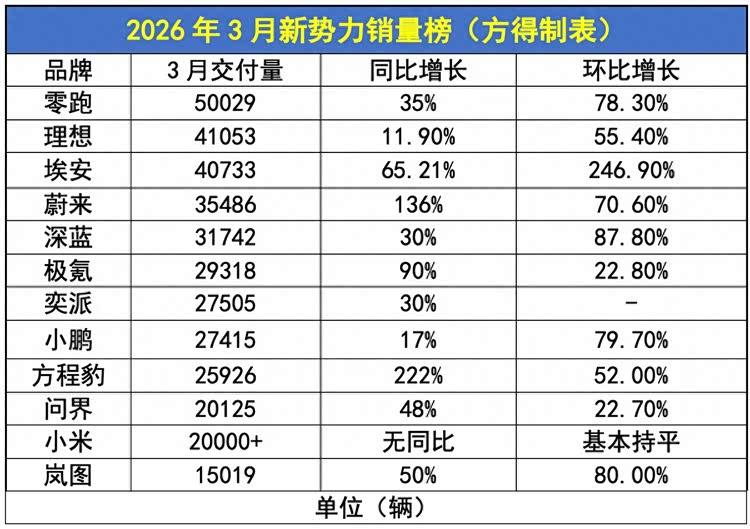 2026年3月,新能源新势力一扫前两个月的阴霾,销量同比环比均增长!零跑再现月销5万,理想则重回4万+,蔚来稳住了3万的销量,极氪交付也接近3万辆,方程豹,更是以220%的增速接近2.6万辆。可以说,蔚小理零传统新势力基本盘稳固,埃安、极氪、奕派、方程豹等传统车企新势力表现也非常亮眼。