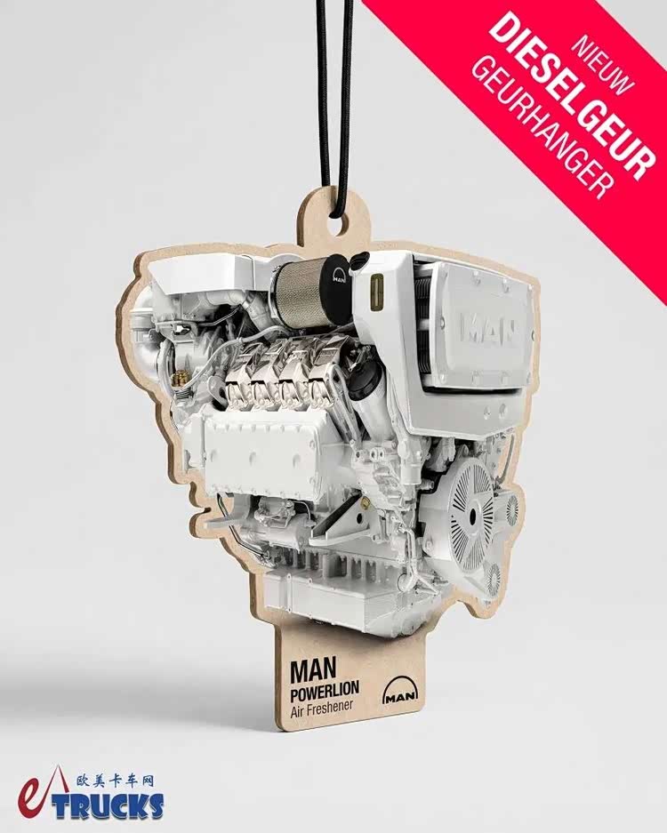 针对这一部分人群,德国曼恩推出了一款特殊的周边产品:PowerLion香氛吊坠。这款吊坠以曼恩船用V8发动机为设计灵感,挂在车内时会缓缓释放出柴油的味道。有了它,怀旧的驾驶员便可以在零排放运输的同时,享受那份令人“值得信赖”的美好柴油气味。不得不说,如果不是愚人节玩笑,这款产品估计会卖爆。