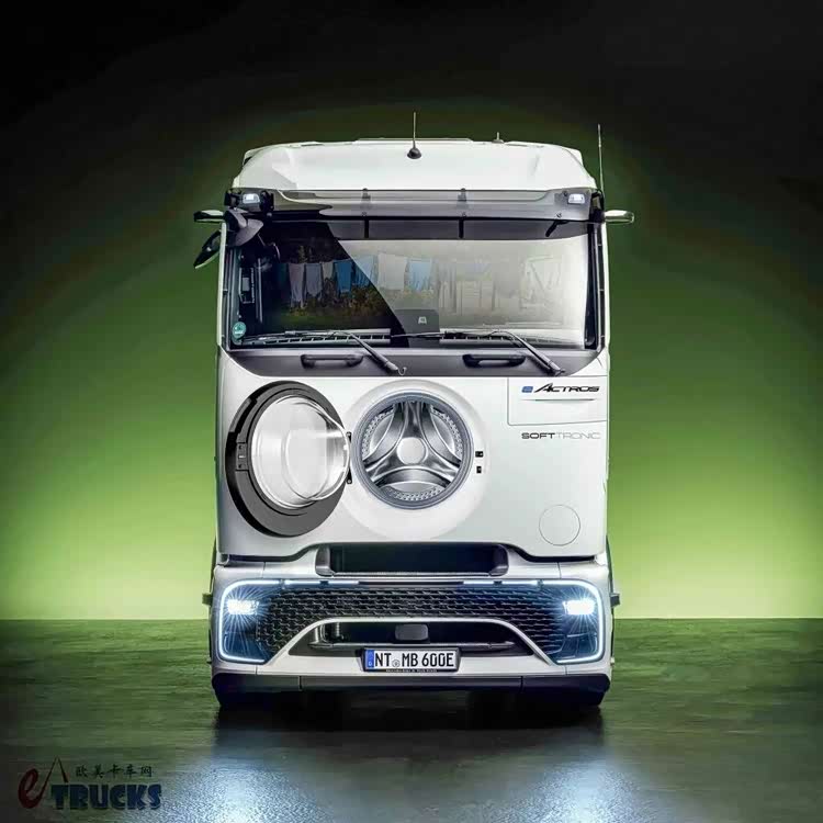 为了改善这一现状,奔驰卡车推出了一款革命性的新品:搭载洗衣机的eActros 600长途电动重卡。据奔驰描述,得益于电动化技术,他们成功在驾驶室下方塞进了一台全自动洗衣机。舱盖取代了原本的三叉星徽车标,而洗衣液、柔顺剂的投放口则巧妙地设计在前脸右上角,与eActros车标融为一体。虽然这只是一个愚人节玩笑,但卡车驾驶员们的生活现状,确实值得我们认真思考。