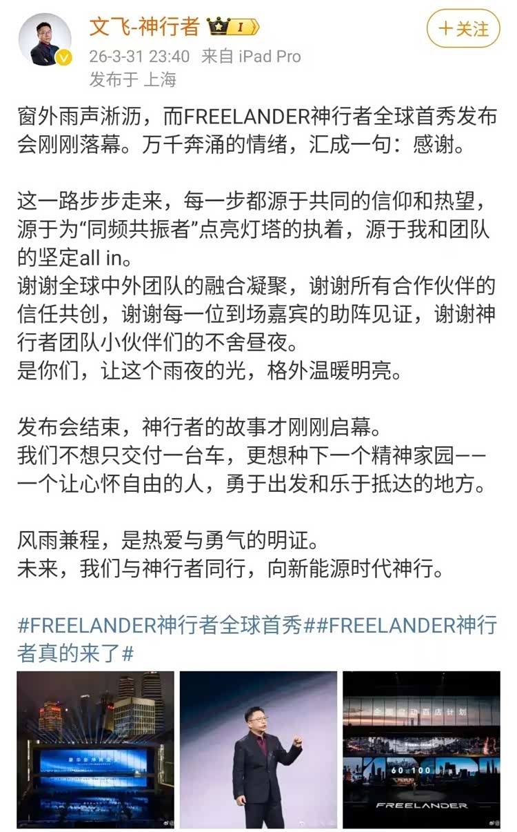 2026年3月31日,奇瑞和捷豹路虎联手打造的新品牌FREELANDER神行者,终于迎来了全球首秀。