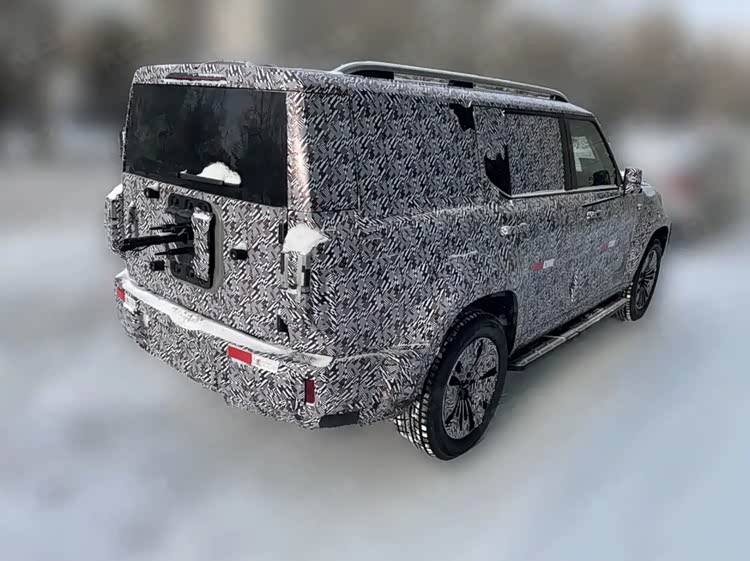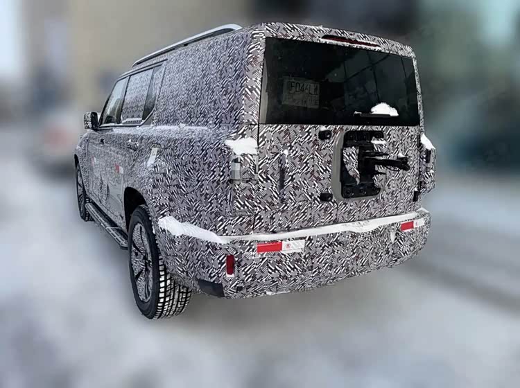 车身侧面轮廓方正挺拔,平直的车顶保障了车内头部空间,搭配固定式侧踏板,方便老人小孩上下车,保留传统机械式门把手,兼顾实用性与复古质感,避免了极端环境下的故障风险。宽大的外抛轮眉搭配大尺寸越野轮毂,进一步强化硬派气场,同时拓宽轮距提升行驶稳定性。车尾设计亮点突出,配备外挂式备胎与侧开式尾门,既彰显越野属性,又方便取放行李,贯穿式LED尾灯与前脸灯组形成呼应,整体造型既硬朗又不失精致。