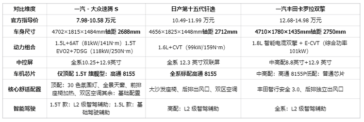 卡罗拉双擎:胜在混动省油(WLTC油耗4.0L/100km)、保值率稳定、品控扎实,2750mm轴距空间表现出色;但价格是硬伤,入门版比速腾S贵且8155P芯片只给中高配。卡罗拉双擎适合追求长期用车成本低、看重保值率的用户。