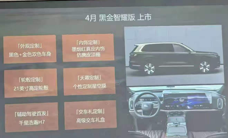 银河M9是一款性价比突出的中大型SUV,目前在售车型限时价为17.38-23.88万元。新车即将加推一款“高定版”。据网络流传信息,新车或将采用“黑金”双拼外观配色,内饰升级为墨烟红真皮搭配仿麂皮顶棚,并配备21英寸高定轮毂、个性定制星空膜。此外,新车将首发搭载千里浩瀚H7智驾方案,购车还可获赠高级轿车礼盒。