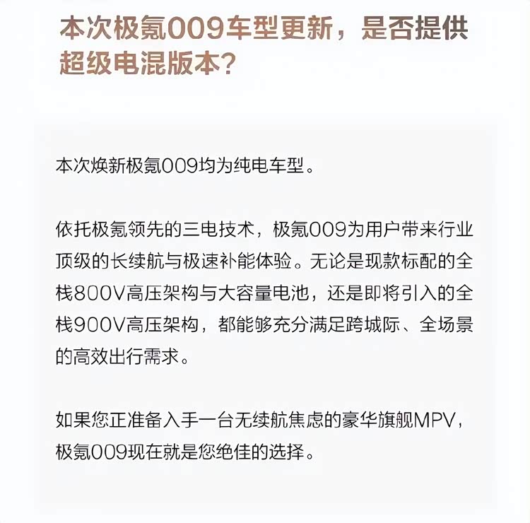 极氪009也算是40万+豪华MPV市场的“顶流选手”了,只不过,随着MPV市场迎来越来越多“9系”产品,它在市场中的份额其实正在被别克至境世家、理想MEGA们蚕食。也是因为市场份额的下滑,一些车迷是提前给极氪规划好了升级路线,比如说为这台旗舰MPV在焕新中加入像极氪9X那样的浩瀚超级电混动力系统。不过,在极氪官方的最新表态中,明确了极氪009焕新版只会有纯电版。可话说回来,这纯电版只要焕新幅度足够大,其实也值得一看。至于说最终达成的方案会如何,咱们就结合目前已公布的信息,好好瞧上一瞧。