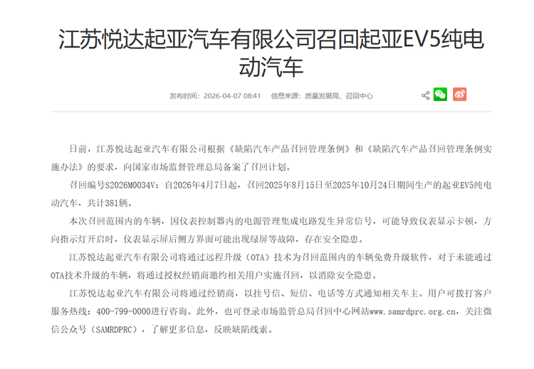 召回编号S2026M0034V,涉及2025年8月15日至2025年10月24日期间生产的部分起亚EV5纯电动汽车,共计381辆。