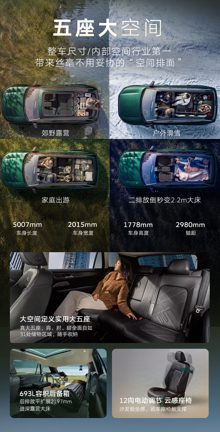 空间表现是全新揽巡的核心竞争力之一。依托超长轴距与超宽车体,新车打造出宽敞舒适的大五座布局,后排腿部与横向空间充裕,乘坐无压抑感;693L超大后备箱支持座椅比例放倒与底板上下调节,空间灵活拓展,可轻松容纳露营装备、行李箱、儿童推车等物品;中控台下方、门板内侧、后备箱等处配备多处人性化储物空间,满足小家庭日常收纳需求,兼顾舒适与实用。