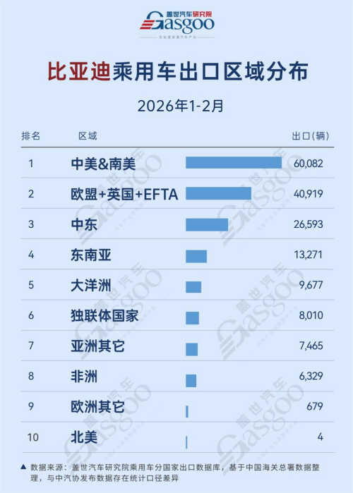 比亚迪在2026年前两月的海外销量分布,较此前阶段出现较为显著的结构变化,核心市场由以往东南亚与欧洲并重,逐步转向以中美&南美、欧洲为主要支撑。