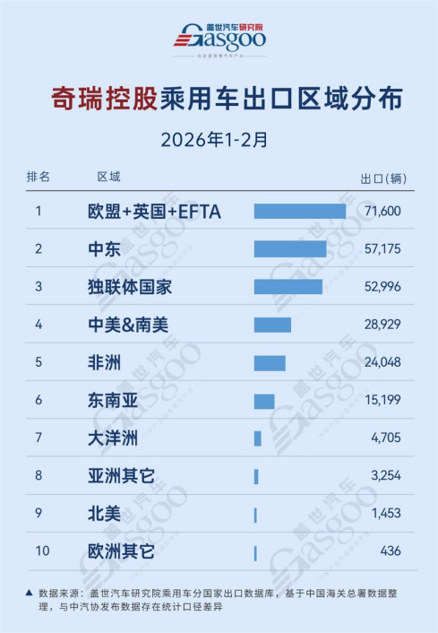 欧盟+英国+EFTA区域为奇瑞当前较大的出口市场,1-2月出口71600辆,在自主品牌中欧洲出口规模相对突出,表明其车型适配、法规认证及市场运营能力已具备在欧洲市场稳定参与竞争的基础条件。中东市场出口57175辆,独联体国家出口52996辆,两大区域销量均突破5万辆,延续了奇瑞在部分传统优势新兴市场的竞争力。