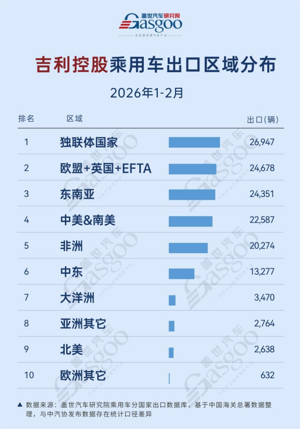 吉利控股1-2月海外出口呈现出各区域分布相对均衡的特征,以传统优势市场为基础,同时在发达市场实现销量提升。