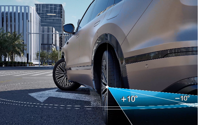 在行驶机构方面,它使用了前双叉臂和后五连杆的独立悬架组合。同时,车辆装备了可调节阻尼和高度的空气悬架系统,这种配置通常旨在兼顾不同路况下的舒适性与操控性。车辆还具备一些提升便利性的功能,比如“蟹行”模式和较小的转弯半径,这些对于在狭窄空间内移动会有帮助。