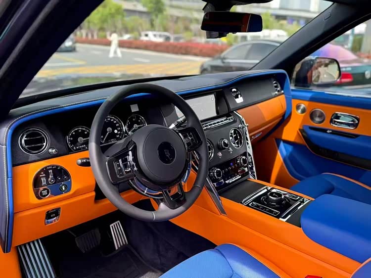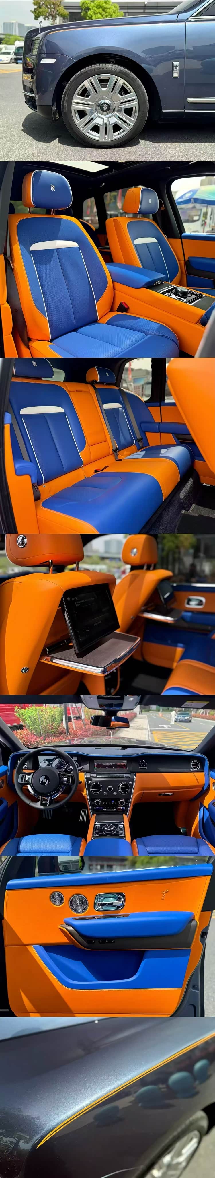 22年劳斯莱斯库里南五座,伊瓜苏蓝外观/克莱因蓝➕爱马仕橙➕极地白三色拼内饰,配置:橘色双腰线,22寸抛光面轮毂,360环影,Bespoke定制音响,抬头显示,座椅通风加热,后排娱乐,小桌板等配置