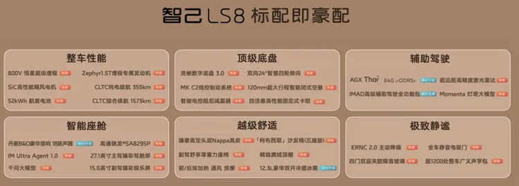 动力上,搭载1.5T增程器,电机综合最大功率390kW,峰值扭矩670Nm,CLTC最大纯电续航为430km,配备800V平台,30%-80%充电12分钟,新车0-100km/h加速4秒级。搭载灵蜥数字底盘3.0,配备前双叉臂+后多连杆悬架,闭式空气悬架+CDC阻尼减振器,全系标配双向24°四轮转向系统等。