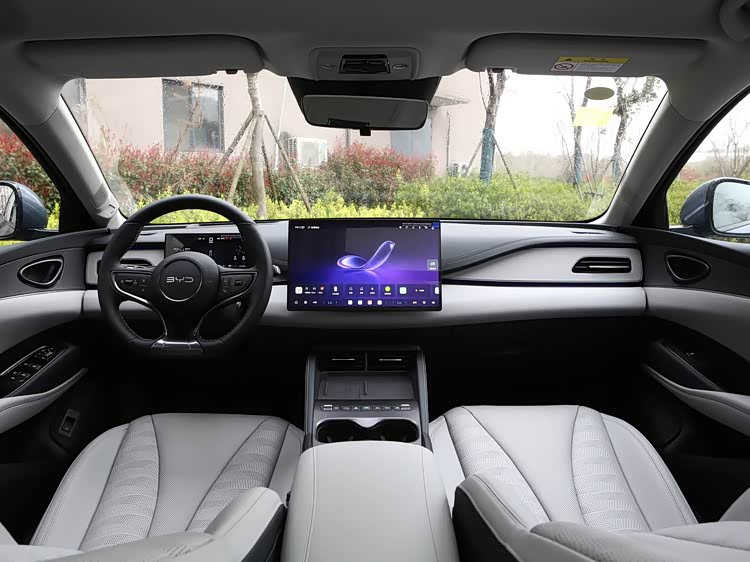进入车内,内饰主打海洋简约 + 舒适实用,中控台采用分层式设计,大面积软质搪塑、皮质包裹 + 缝线工艺,搭配哑光金属饰条与海洋蓝装饰,触感细腻、质感越级,摆脱同价位家用车的廉价感。中控台搭载10.25 英寸全液晶仪表 + 15.6 英寸悬浮式旋转中控屏,搭载比亚迪 DiLink 智能网联系统,界面流畅、响应快,支持高德导航、四音区语音控制、CarPlay/HiCar、OTA 升级,操作逻辑清晰,新手易上手。