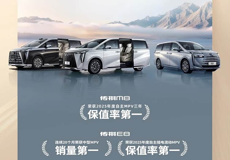 首先,广汽传祺MPV市场积淀足够深厚。用不到十年的时间,就完成了从破局者到领军者的跨越,MPV累计销量已突破85万辆。其中,作为保有量第一的自主豪华MPV,传祺M8荣获2025年度自主MPV三年保值率第一;传祺E8连续20个月荣获中型MPV销量冠军,并荣获2025年度自主插电混动MPV保值率第一。
