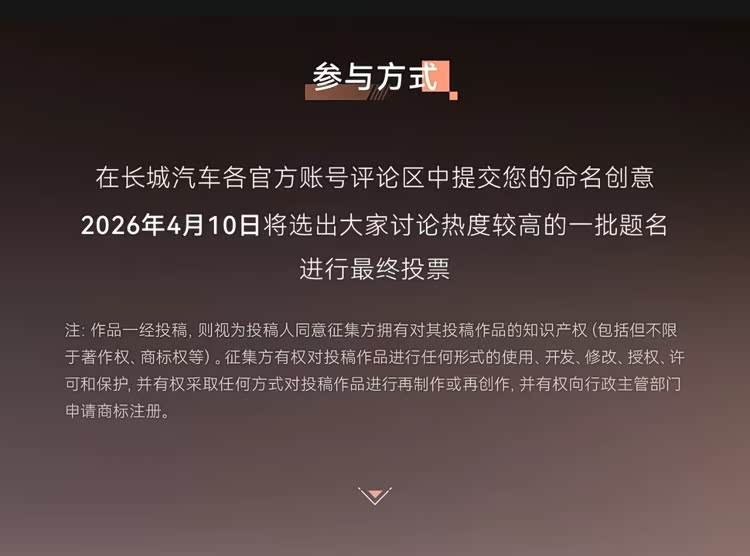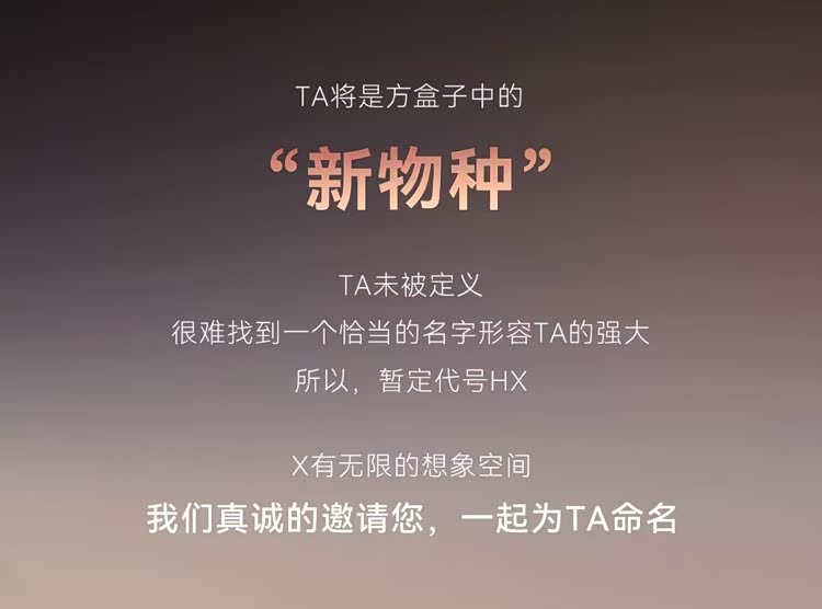 哈弗全新方盒子SUV曝光,属于归元平台首款旗舰方盒子,长城官方称其为方盒子中的“新物种”,很难找到一个恰当的名字形容TA的强大,暂定代号“HX”,现已开启征名活动,大家可以在长城汽车各官方账号评论区提交命名创意,将选出热度高的提名,并于4月10日公布提名并进行最终投票。