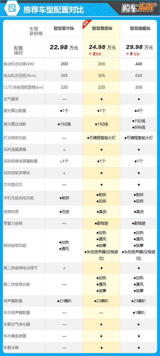 推荐车型相比智慧豪华版贵了2万元,配置方面的增幅则更加显著,不仅提供了空气悬架和可编程智能大灯,还标配后排中央扶手触控屏、方向盘记忆、后排手机无线充电功能、后排座椅加热/通风/按摩、副驾驶零重力座椅、车载空气净化器、车载冰箱等一系列舒适性和便利性配置,同时座椅材质也从仿皮升级为真皮,带来更出色的驾乘体验。