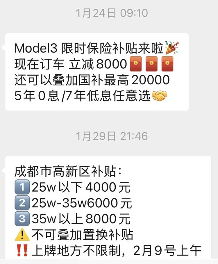 由于此前探访过程中与特斯拉某销售人员小L保持着联系,她也时不时给我发来相关的促销信息,包括金融优惠、限时补贴等等。