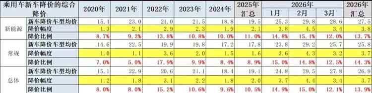 4月6日,乘联会秘书长崔东树发了一篇名为《2026年3月乘用车市场降价促销分析》的文章,其中有一组数据让我不禁多瞧了几眼:2026年3月份,总体乘用车市场新车降价车型均价27.8万元的降价力度算术平均达到3.4万元,降价幅度达到12.1%的较高水平;2026年1-3月,总体乘用车市场新车降价车型均价26.9万元的降价力度算术平均达到3.7万元,降价幅度达到13.7%。