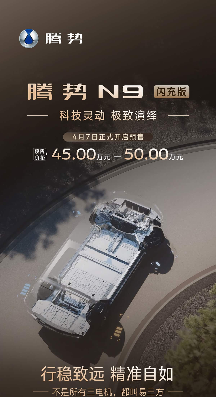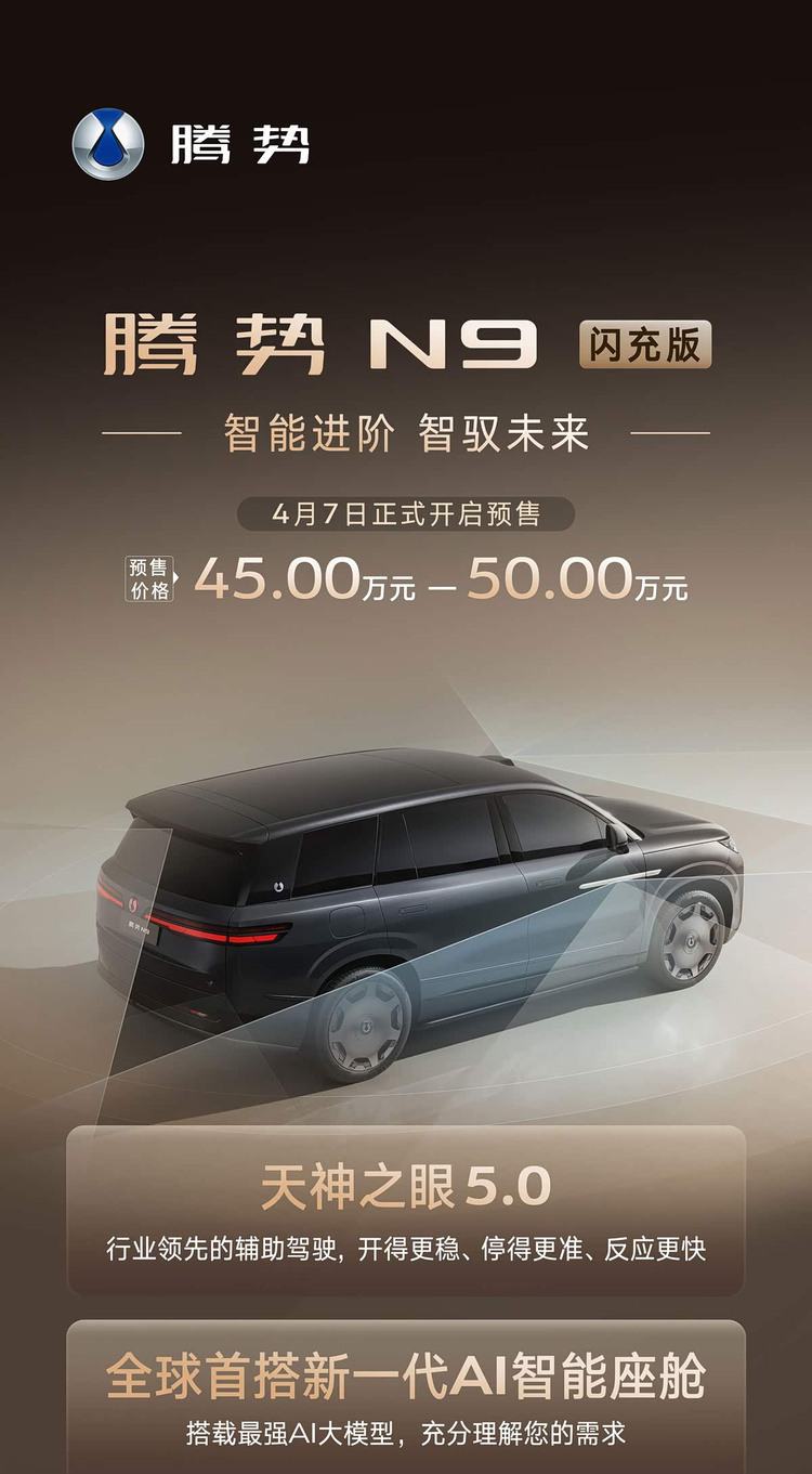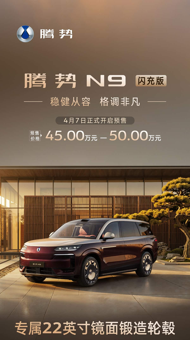 腾势汽车近日宣布,旗下大型SUV腾势N9的新增车型——闪充版,正式开始预售,新车的预售价格范围在45万元至50万元之间。这次推出的版本主要变化在于核心部件的更新,例如采用了新的电池组,并对智能座舱系统进行了升级。