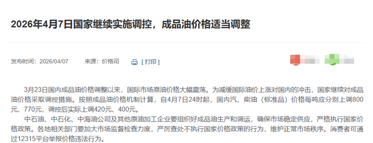 车家号·0浏览·2026-04-07 18:57 · 上海自从伊朗严控霍尔木兹海峡之后,国际油价就一路走高,连带着国内成品油价格也一路上涨。每到国内成品油调价日的时候,燃油车用户们的心就跟买彩票等开奖一样,反正少涨就是赚。这不4月7日了,发改委发布通知,国内成品油价格开启新一轮调整。