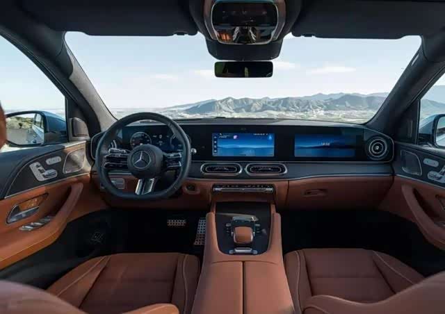 内饰是这次升级的重头戏。新款GLE换装了MBUX Superscreen超联屏——由12.3英寸仪表+14英寸中控+14英寸副驾屏组成的“三联屏”组合。空调出风口改成了圆形,方向盘重新设计,但保留了实体按键和音量滚轮。