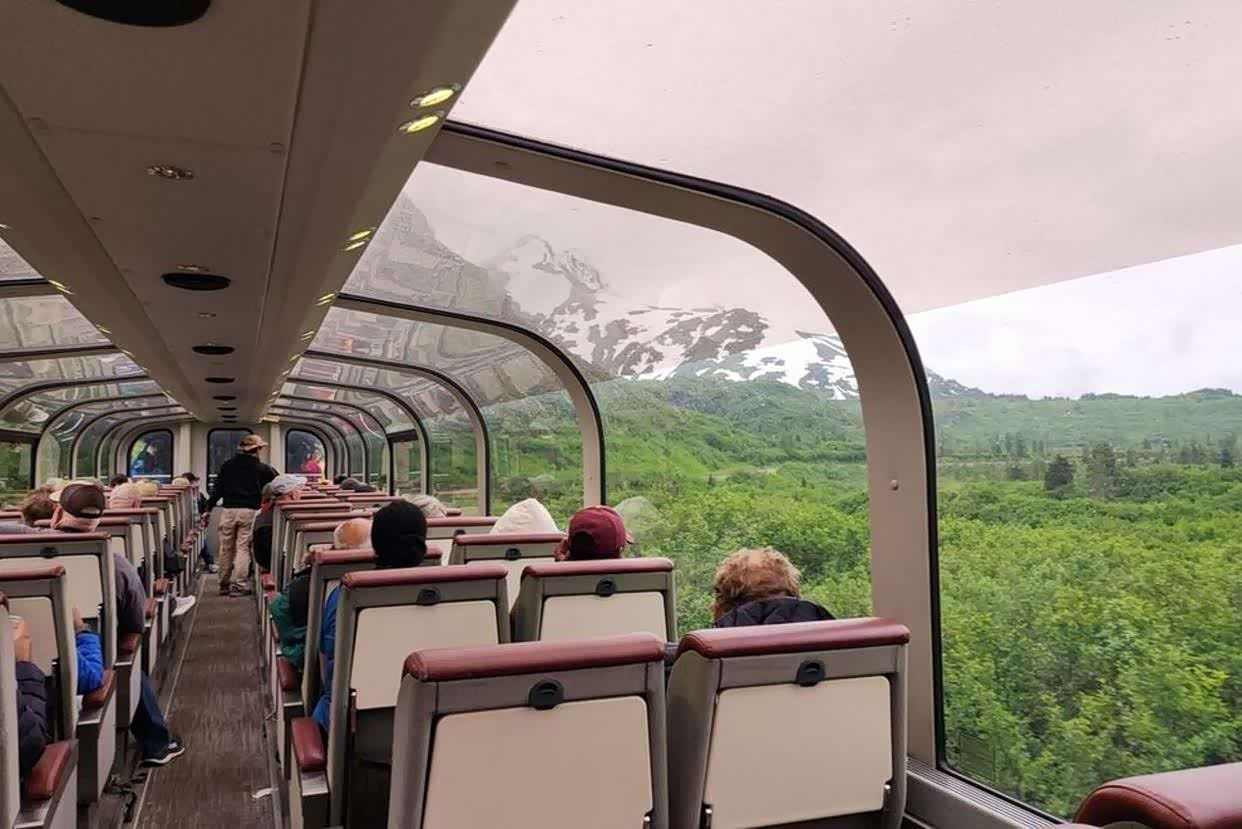 乘坐铁路探索阿拉斯加,沿途的景色壮丽无比,乘客们跃起身来,仿佛在观看一场精彩绝伦的演出,这在当时并不罕见。海岸经典列车穿过安克雷奇郊外的坦纳根海湾,巍峨的楚加奇山脉的倒影在海面上翻腾。过了坦纳根海湾后,列车驶入内陆地区,那里森林、野花、湖泊、山脉和冰川环绕着铁轨。