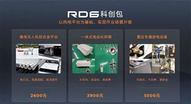 针对乡村用车场景,助力科技兴农的雷达RD6科创包同步发售,共包含植保无人机铝合金平台、一体式自动化药箱以及专属放电设备三大组件,分别售价2600元、3900元以及5500元。